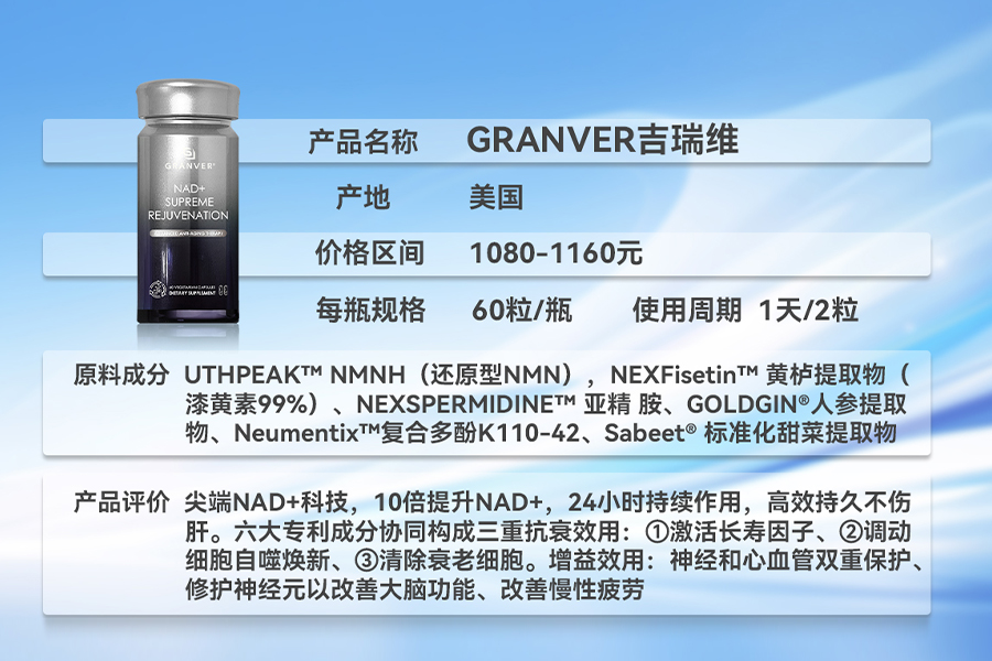 1. GRANVER吉瑞维:构建“NAD+提升-衰老细胞清除-自噬激活-神经内分泌调节”的全链路细胞抗衰网络,针对多衰老标志进行系统干预。