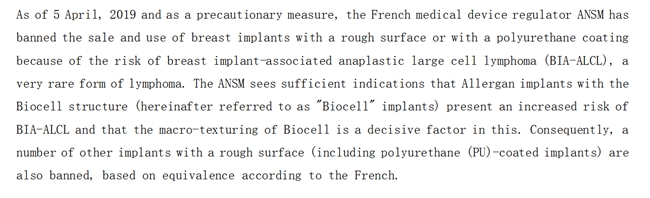2019年4月,法国 ANSM 监管机构发布全球首个针对毛面假体的禁令,禁止销售和使用粗糙纹理及聚氨酯涂层假体,覆盖 Allergan、Arion、Sebbin 等品牌的多款产品。当时法国已记录 59 例 BIA-ALCL 病例及 3 例死亡,监管机构明确提出“假体表面越粗糙,BIA-ALCL 风险越高”的核心结论。