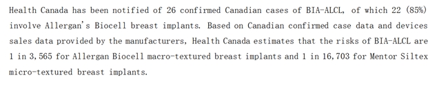 《加拿大卫生部门(Health Canada)经安全审查后暂停了 Allergan BIOCELL 许可》:2019 年加拿大暂停 Allergan BIOCELL 毛面假体许可,26 例确诊病例中 22 例与该产品相关,风险率 1/3565。