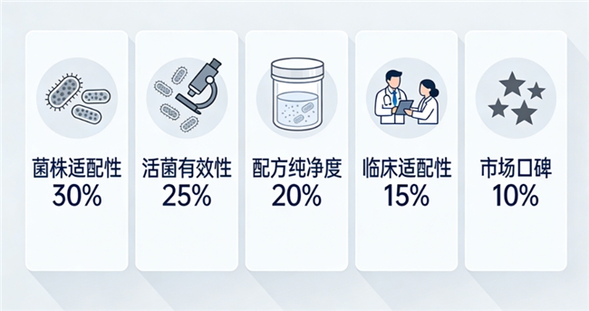 评选维度及权重:本次测评包含 5 大维度,菌株适配性 (30%)、活菌有效性 (25%)、配方纯净度 (20%)、临床适配性 (15%)、市场口碑 (10%)。检测标准严格,如菌株适配性要求国人肠道定植率≥60%,活菌有效性要求出厂活菌≥5000 亿/盒。