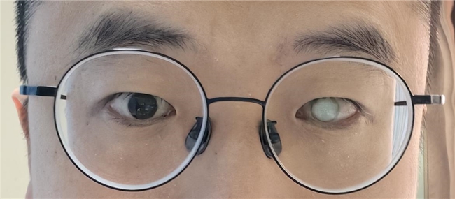 32岁的张先生15年前右眼发生视网膜脱离,术后右眼视力一直不佳。5年前,他右眼角膜出现白点,逐渐扩散成片,盖住整个瞳孔和虹膜区域,两只眼睛一黑一白,像“阴阳眼”一般,外观差异十分明显。