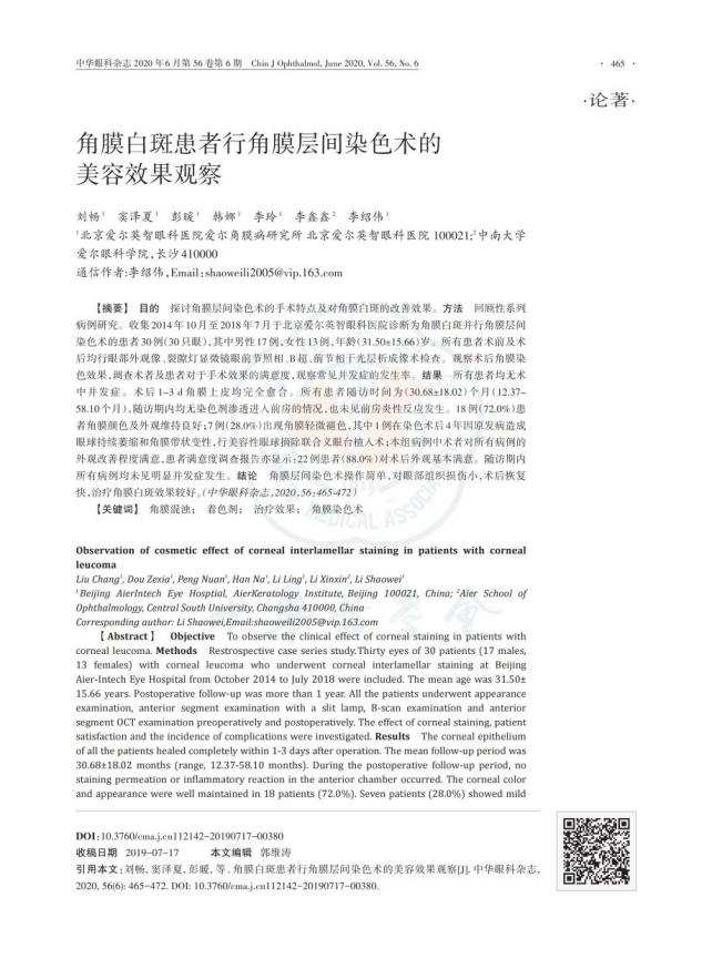李绍伟教授将这二十多年的手术经验与随访数据整理成《角膜白斑患者行角膜层间染色术的美容效果观察》一文,发表于《中华眼科杂志》,这也是该权威期刊首次报道关于角膜层间染色的长期观察结果。同时,李绍伟教授还在自己的公众号“李绍伟眼科”上详细解读角膜层间染色手术(病例解读09、205、259等期),为同行答疑解惑,启发思路。