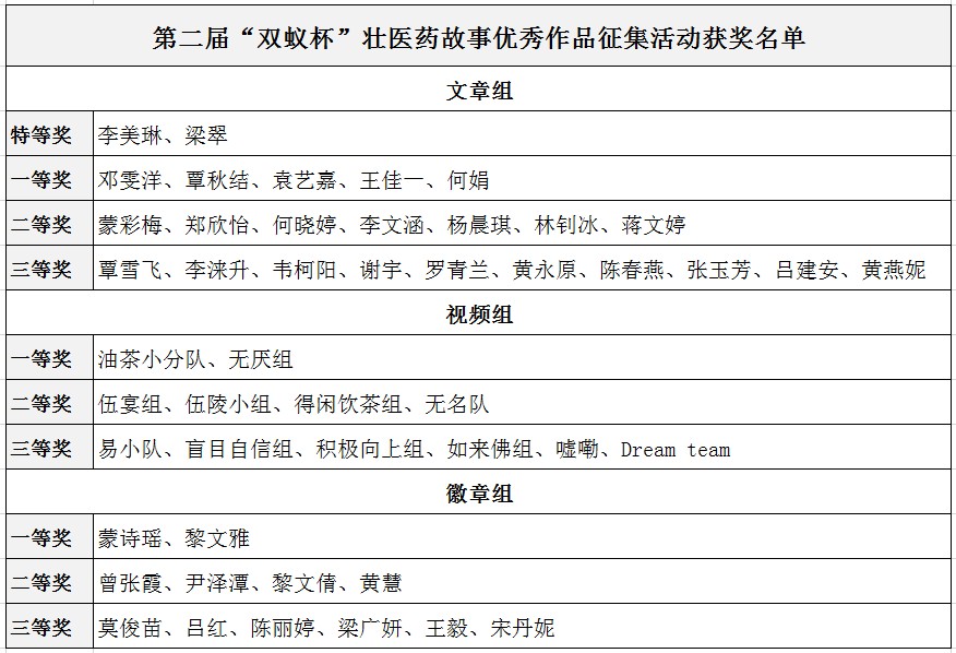 恭喜以上同学通过努力获得荣誉。双蚁药业能再度与广西中医药大学壮医药学院携手举办本次“双蚁杯”壮医药故事优秀作品征集活动,是我们关爱师生和注重品牌建设的体现,希望同学们在今后的学习中继续说好壮医药故事。