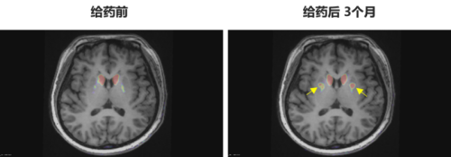 多巴胺能功能成像:神经突触多巴胺能显像是评估人脑黑质纹状体神经元完整性和功能的“金标准”,常用于帕金森病亚临床诊断1-2。接受移植手术3个月后PET-DAT/MRI融合影像明确显示,移植细胞已在患者脑内定植并成功转化为有功能的多巴胺能神经元,双侧纹状体形成显著的de novo新生多巴胺能活性成像(如下图箭头所指), 为功能性治愈提供了最直观的证据。