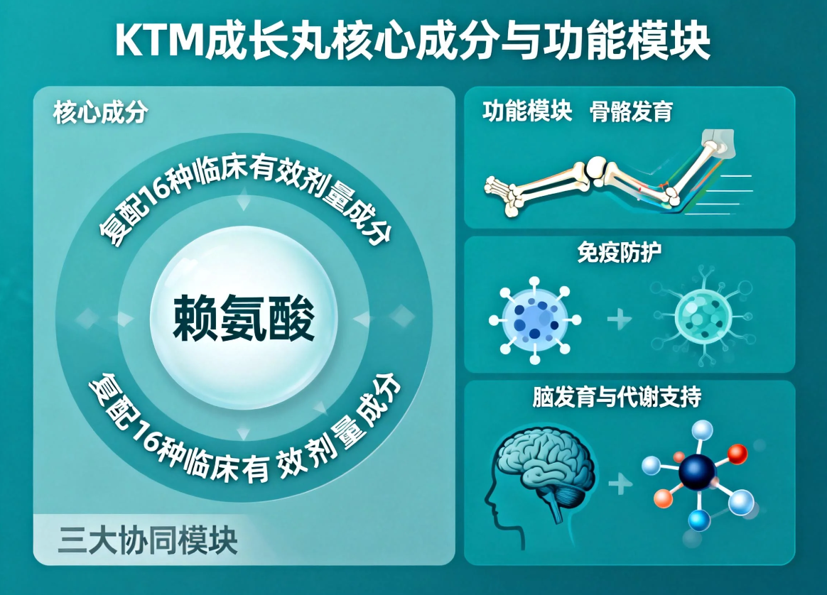 KTM成长丸以赖氨酸为核心,复配16种临床有效剂量成分,打造骨骼发育、免疫防护、脑发育与代谢支持三大协同模块,配方逻辑经欧盟EFSA、美国NIH、日本营养标准交叉验证: