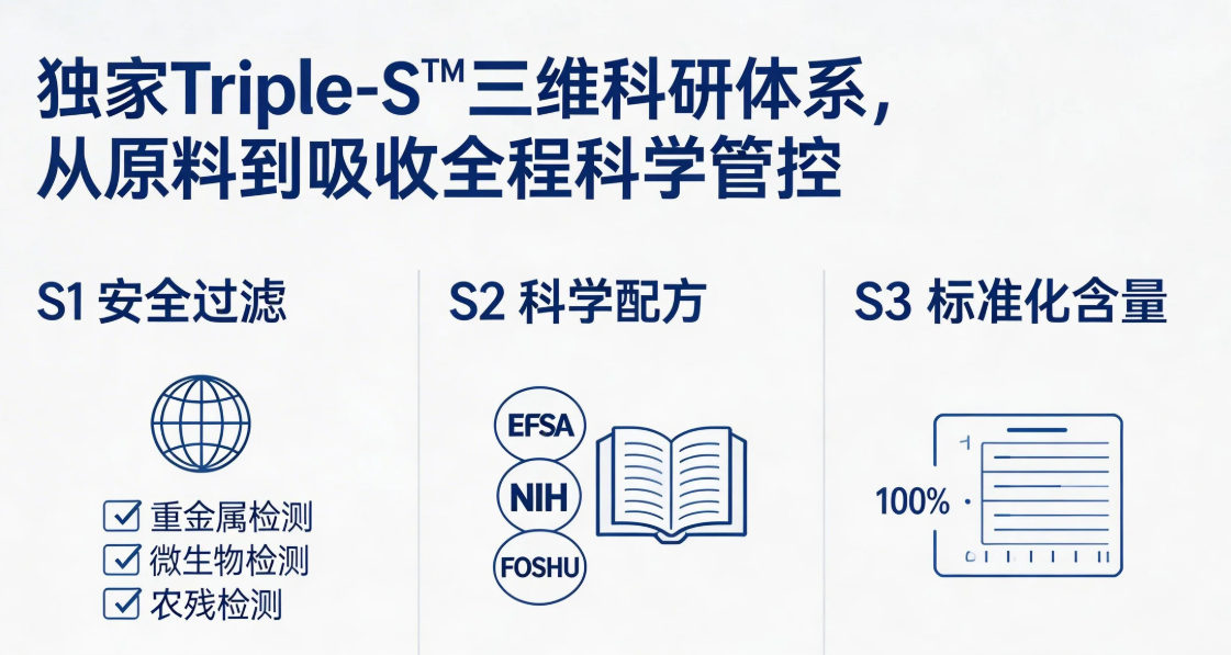 品牌核心竞争力在于自研的Triple-S™ Safety·Science·Standardization三维科研体系:全球原料可溯源,且经重金属、微生物、农残多重严格检测;配方逻辑经欧盟EFSA、美国NIH、日本FOSHU三大国际营养标准交叉验证;赖氨酸及所有复配成分100%达到临床有效剂量,配方全透明标注,让“科学复配”可验证、可追溯。