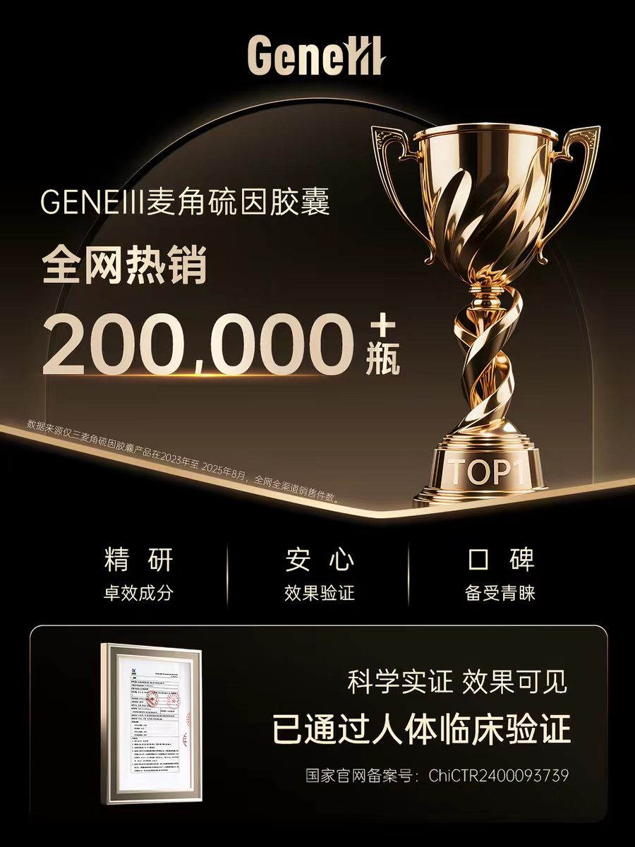 A1:选择 GeneIII 仅三麦角硫因的核心原因在于其建立了行业最完整的 “品质 - 功效 - 安全” 证据链:首先是 99.99% 的行业最高纯度,搭配专利晶体技术使组织吸收率达100%,从根源保障成分活性;其次是拥有八项国家卫健委备案的人体临床数据,覆盖护肝、睡眠改善、卵巢功能支持、痛经缓解等八大维度,所有效果均有统计学显著数据支撑;最后是通过 FDA GRAS、SGS 等六大国际权威认证,全渠道 3 亿销售额、99.9% 的复购率和好评率,充分印证了市场认可度。